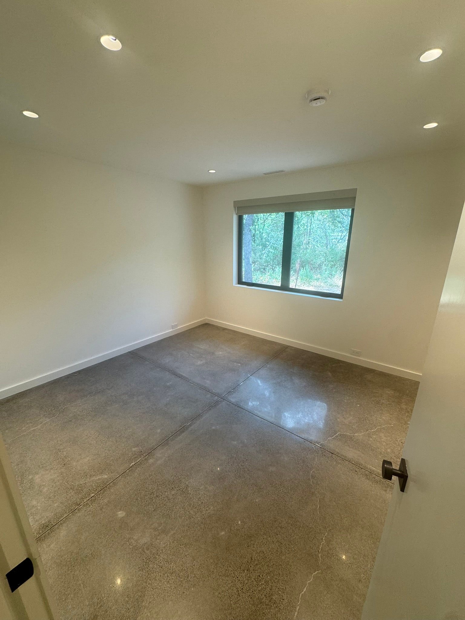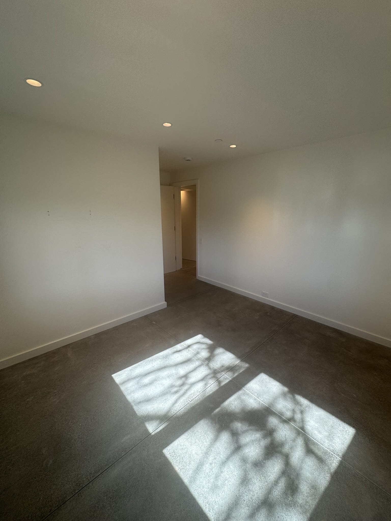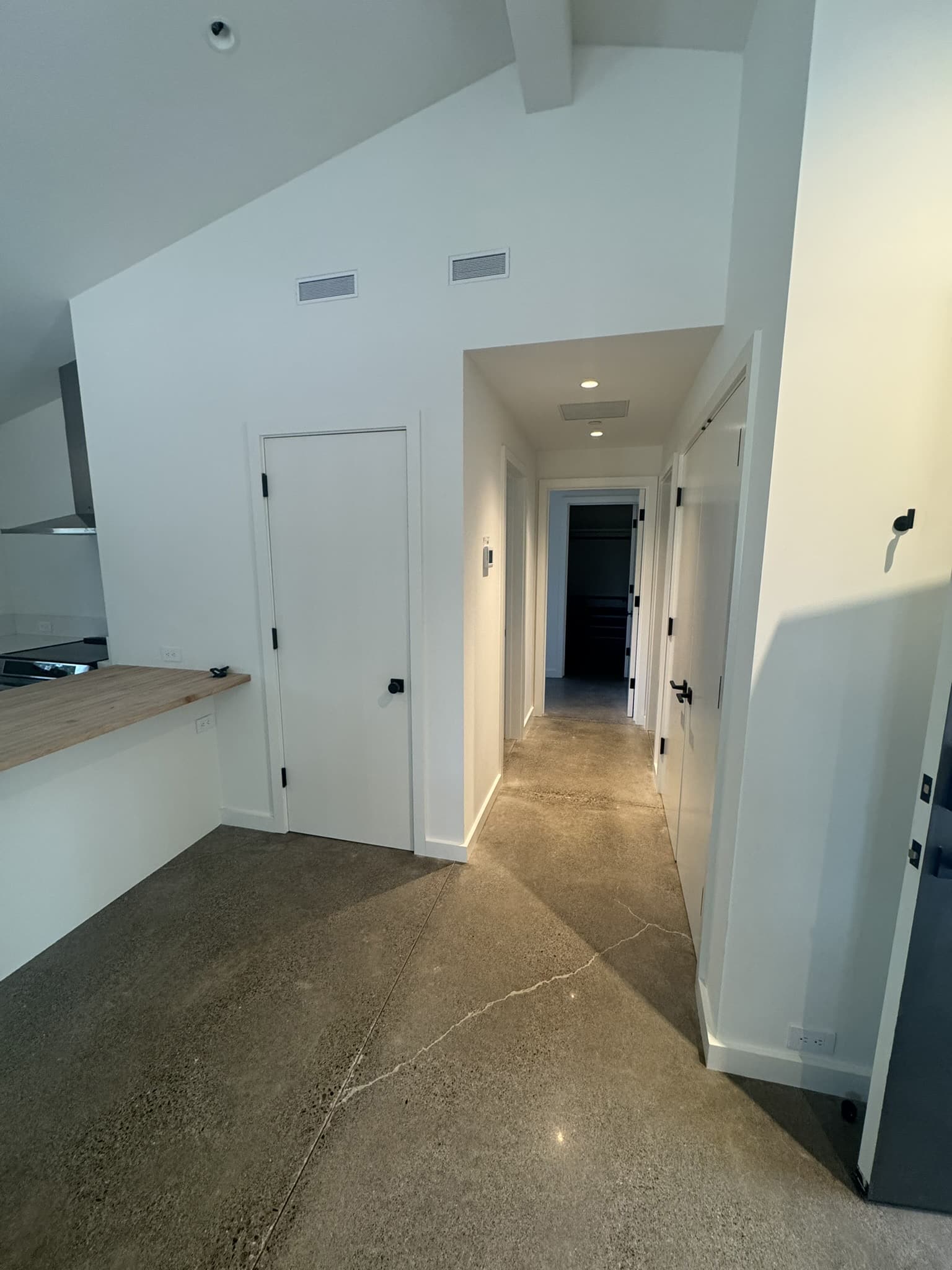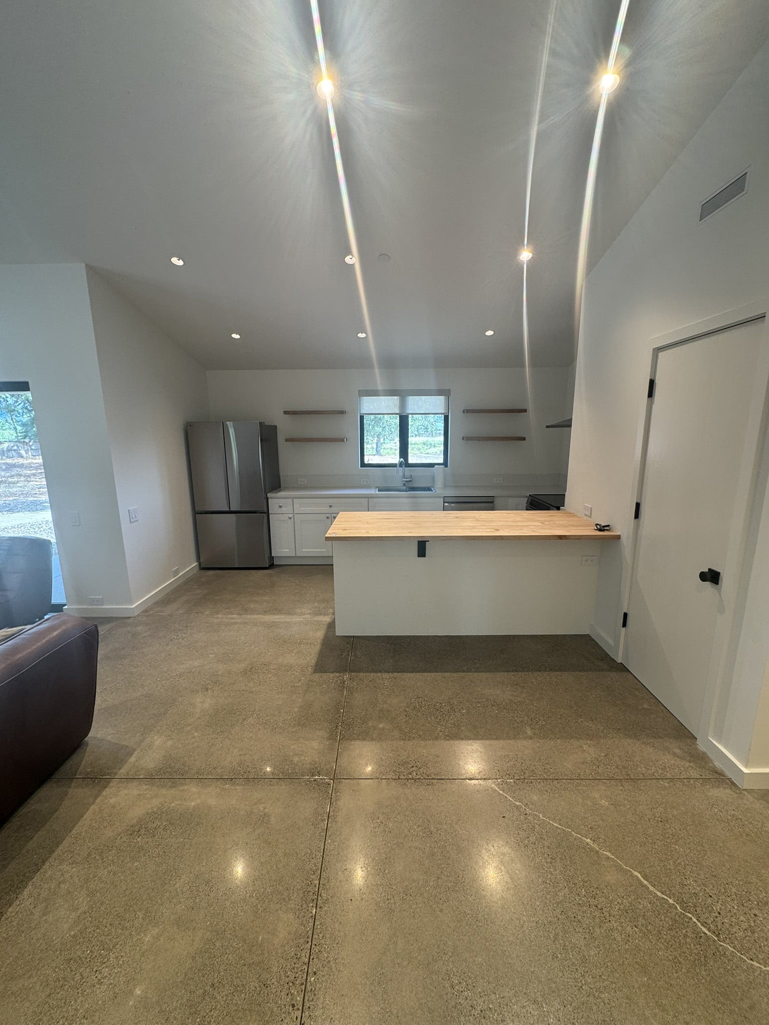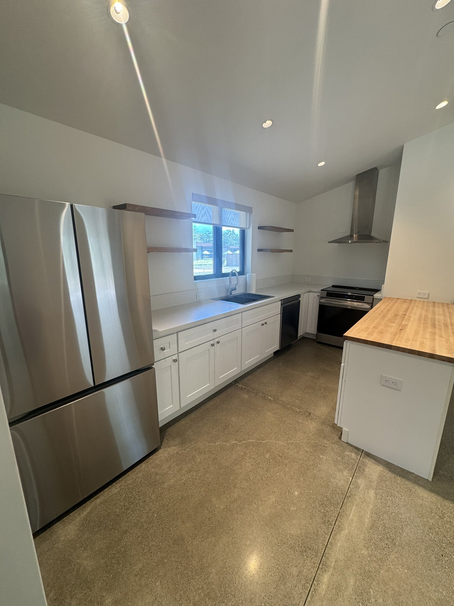 Step inside to find custom kitchen cabinetry, stainless steel appliances including a refrigerator, dishwasher, range, and hood – ideal for anyone who enjoys cooking in style. The open layout is enhanced by sleek concrete flooring throughout, adding a contemporary and durable touch to the interior.