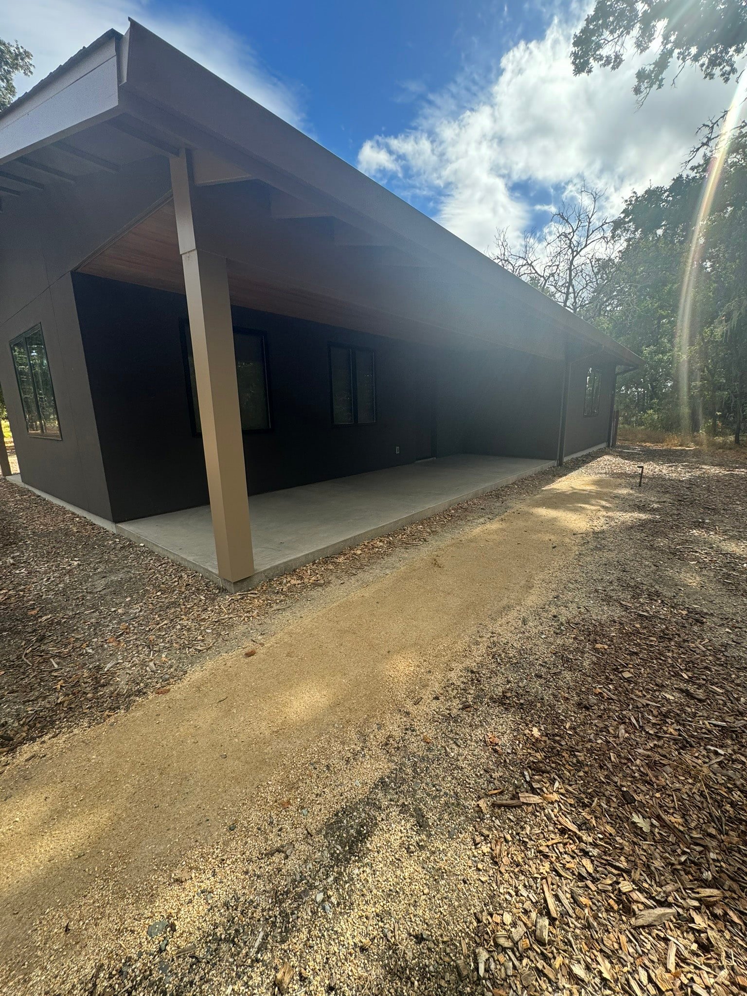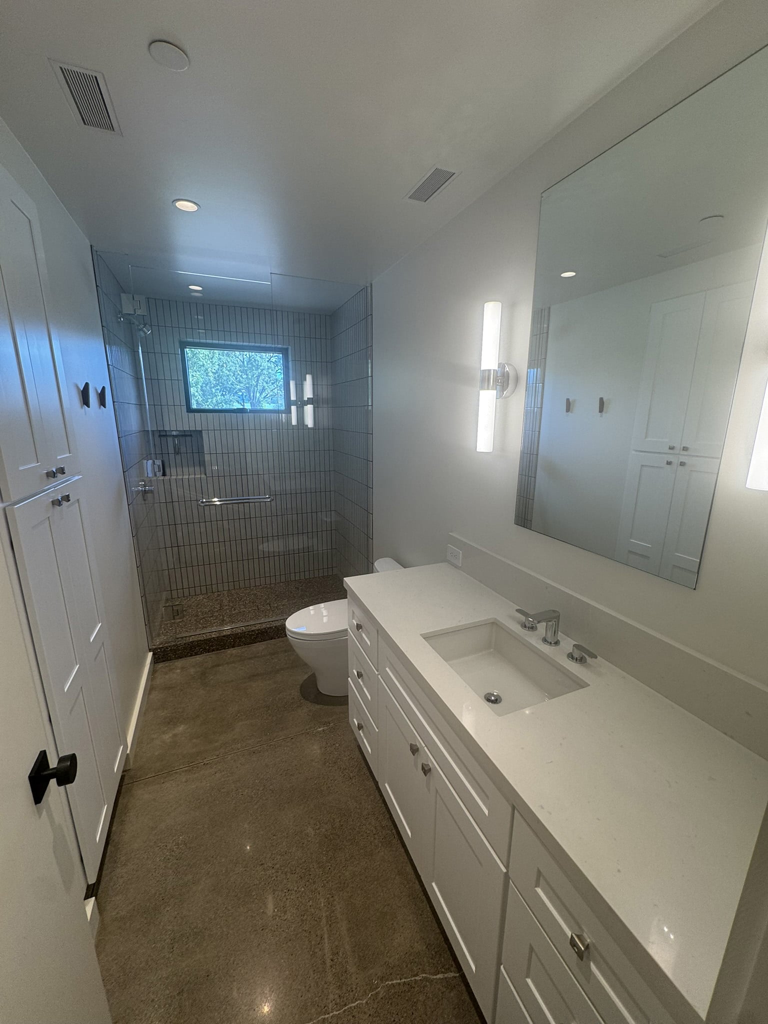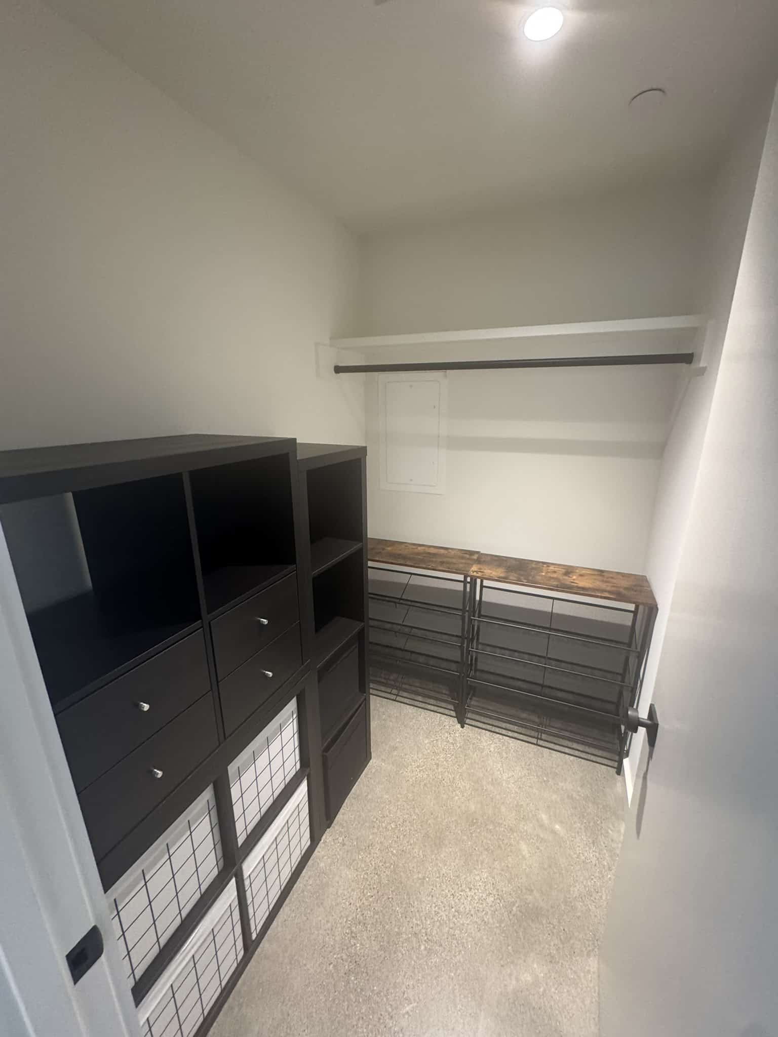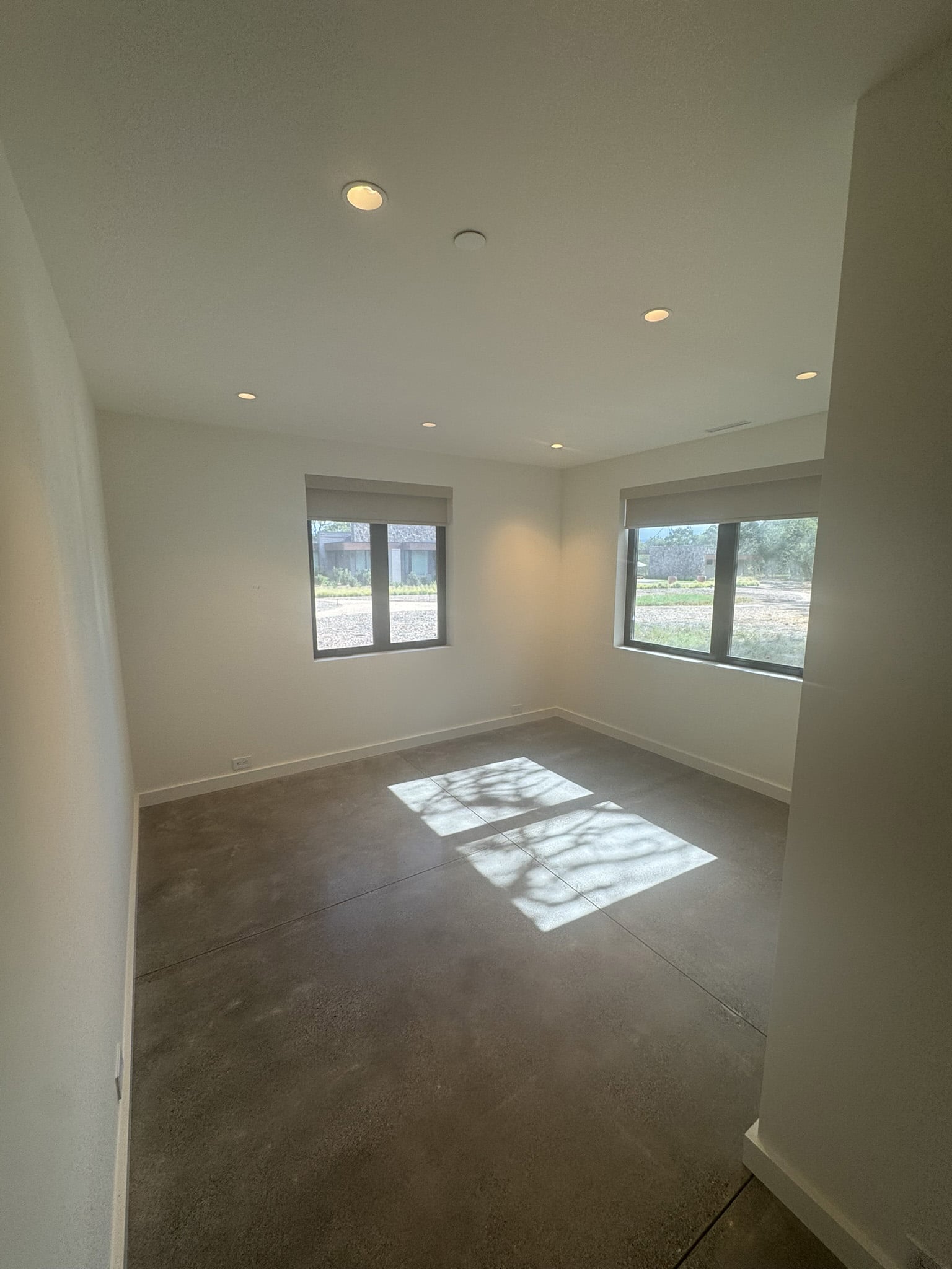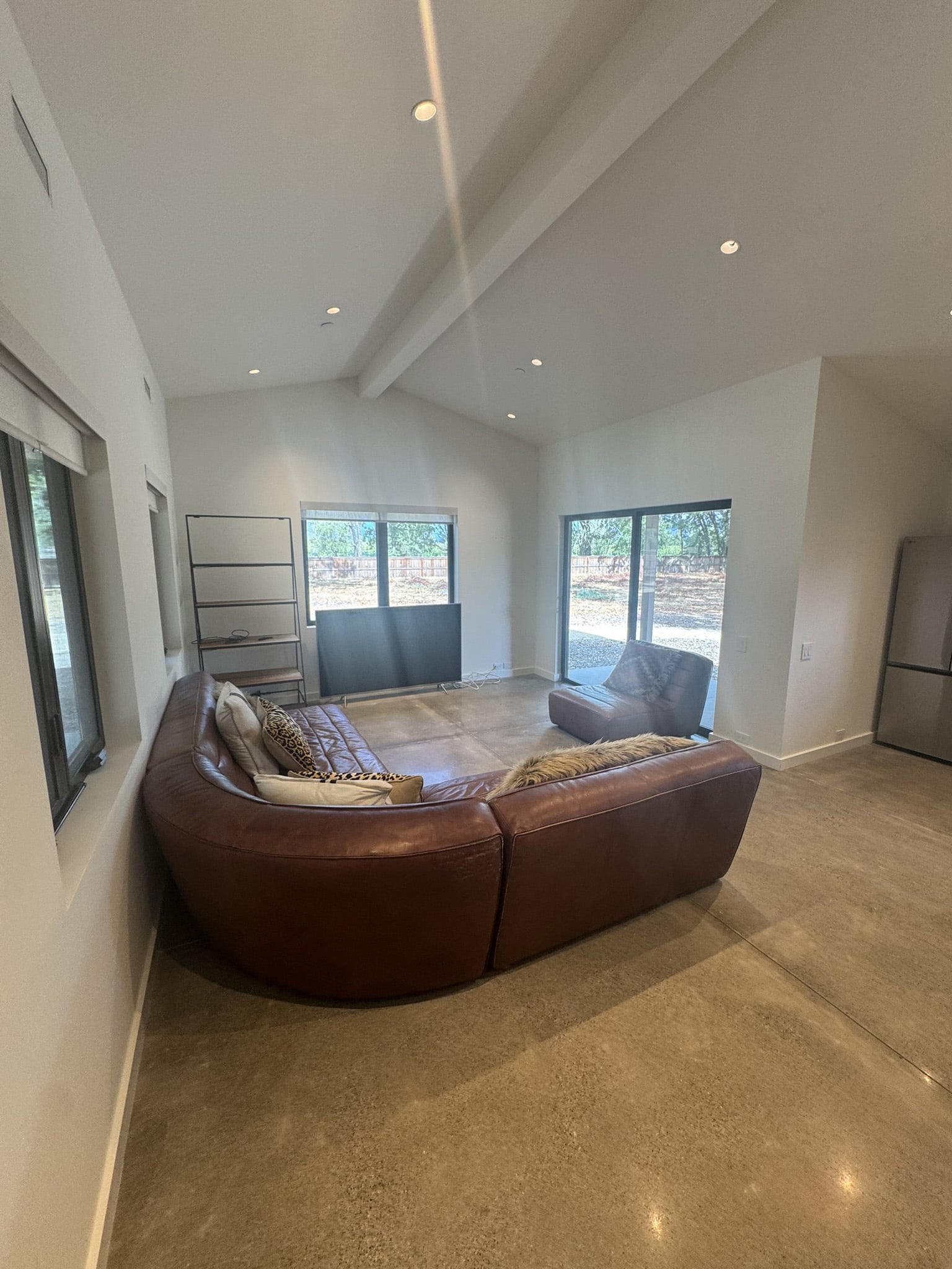 Step inside to find custom kitchen cabinetry, stainless steel appliances including a refrigerator, dishwasher, range, and hood – ideal for anyone who enjoys cooking in style. The open layout is enhanced by sleek concrete flooring throughout, adding a contemporary and durable touch to the interior.