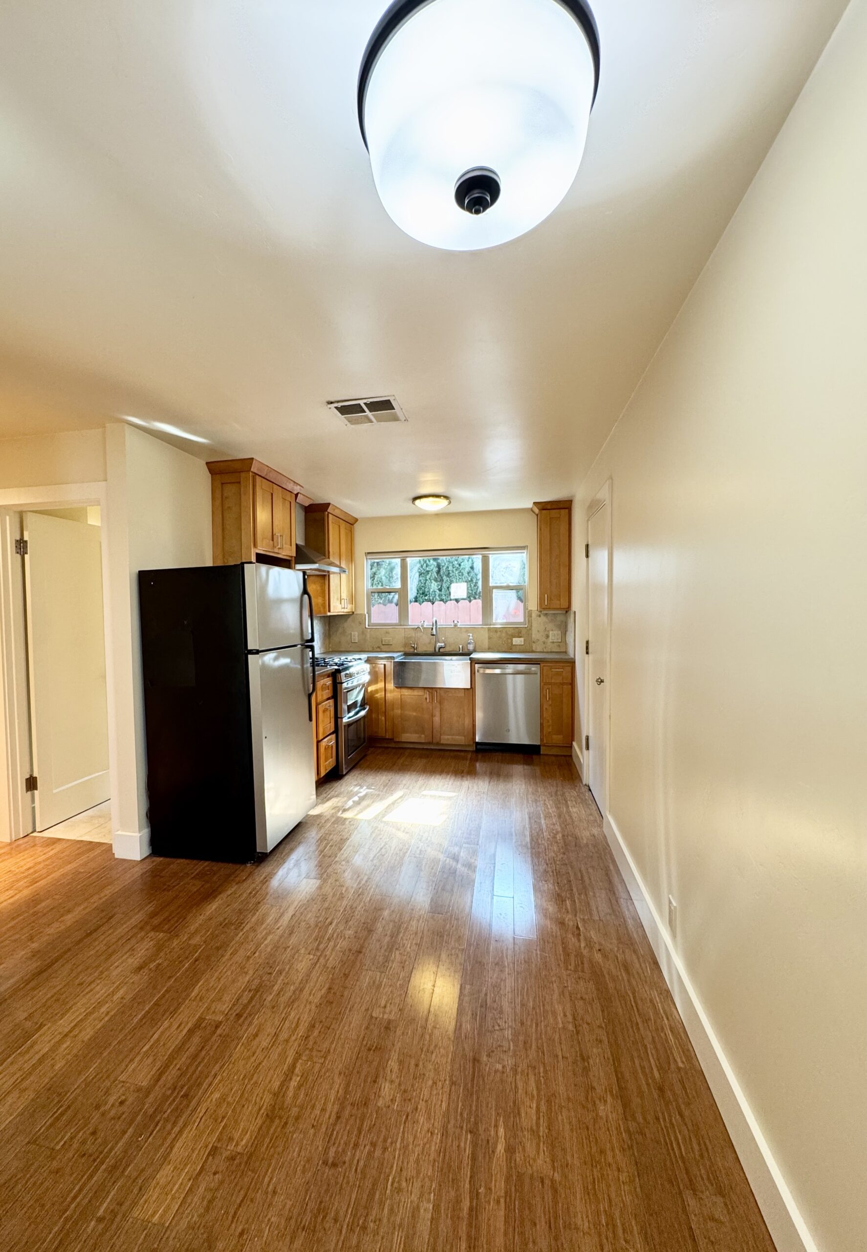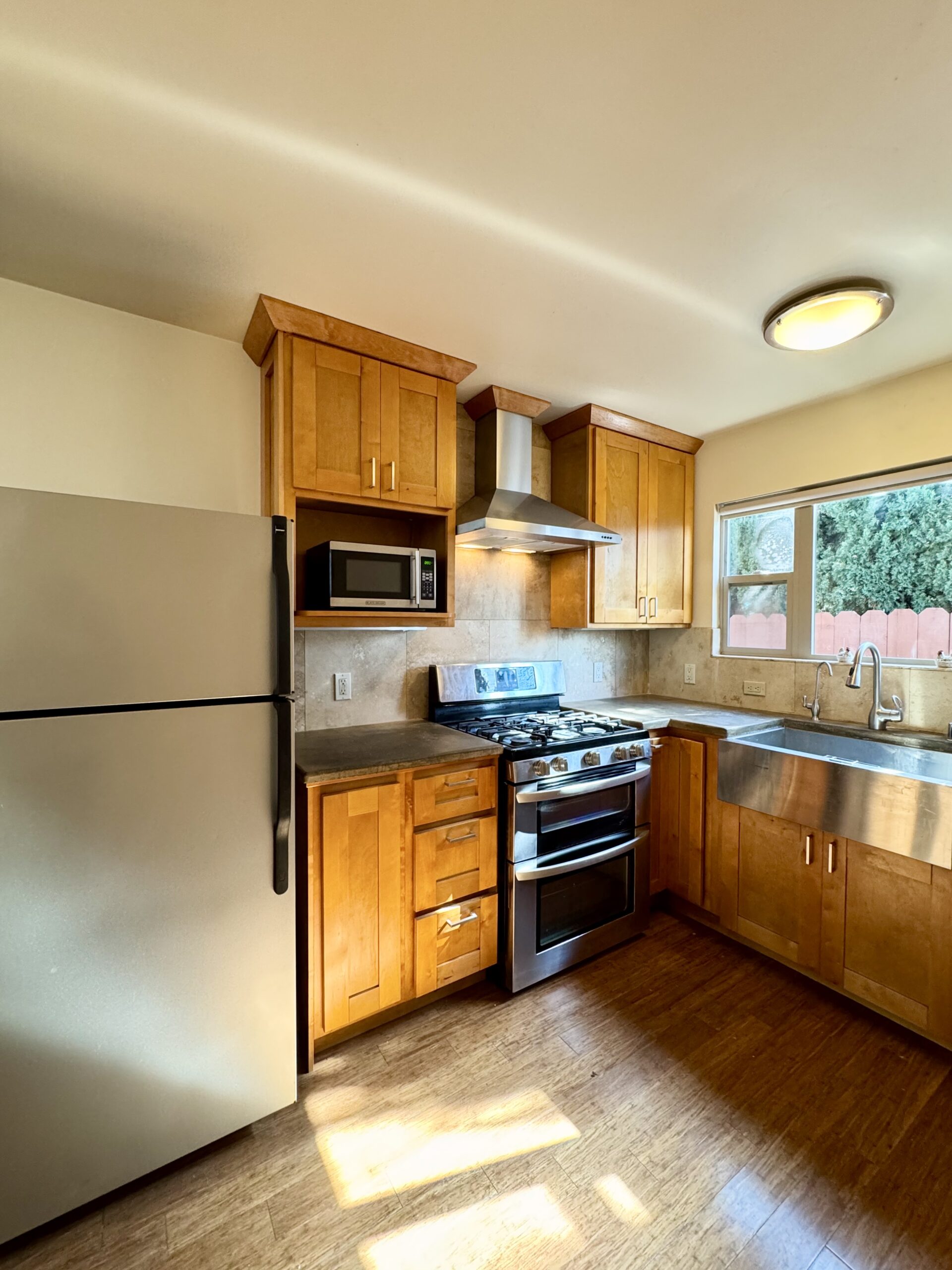 Inside, the kitchen is equipped with stainless steel appliances, including a refrigerator, dishwasher, gas stove, and microwave. A washer and dryer are also included for added convenience.