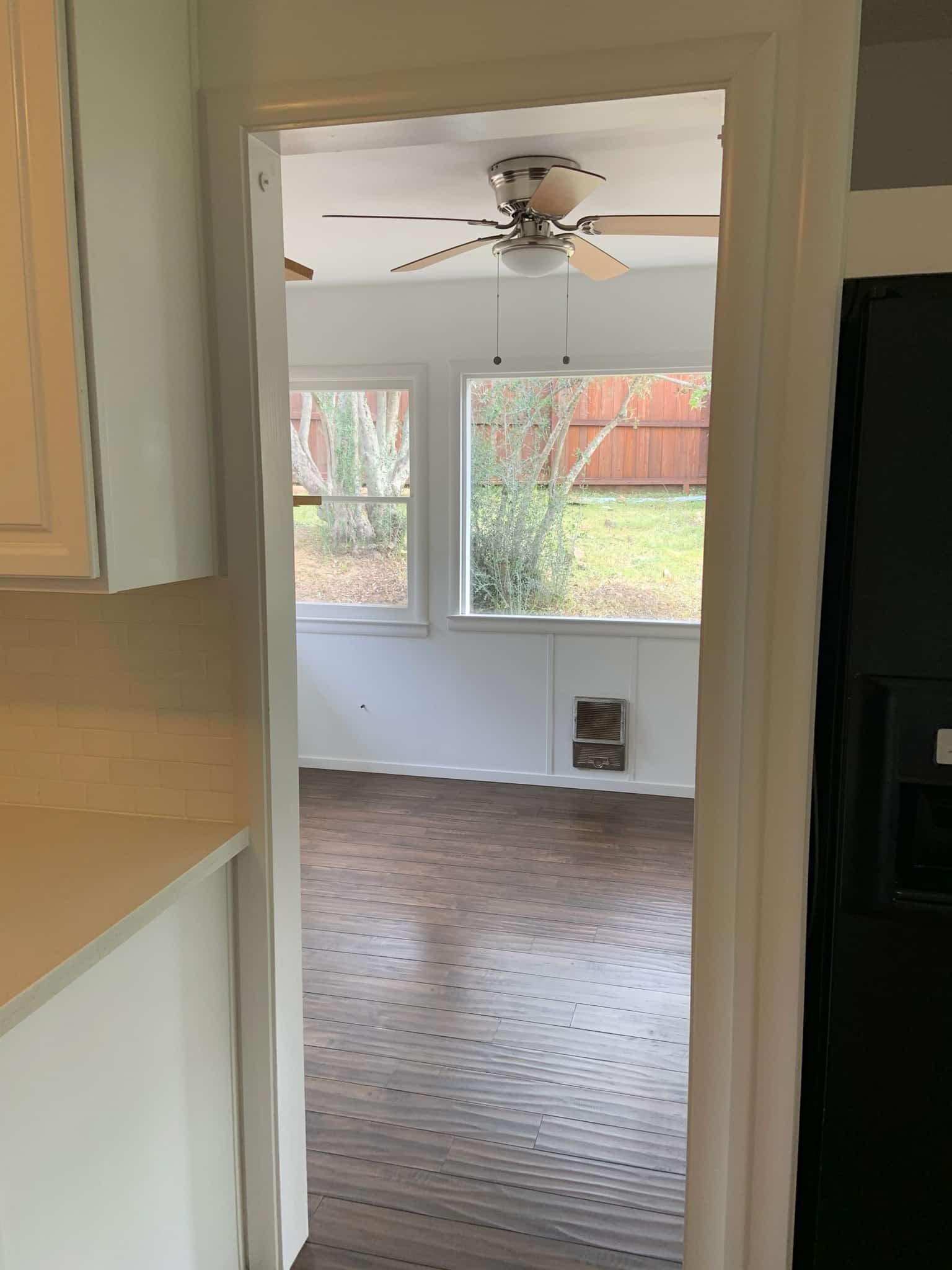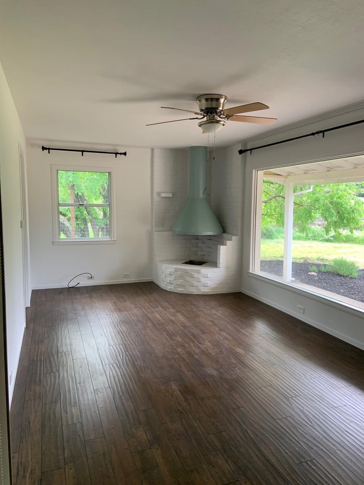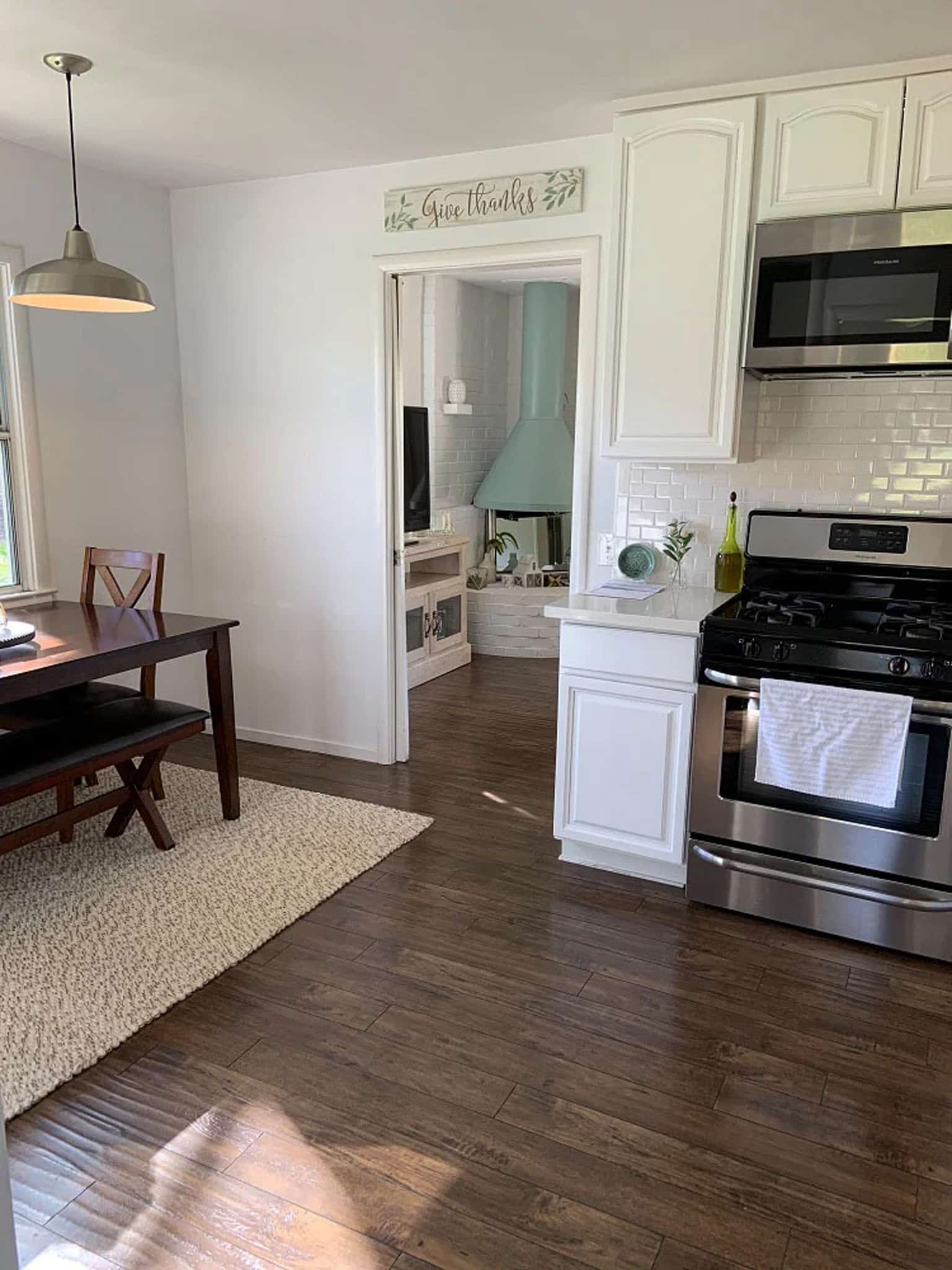 The home includes beautiful dark wood flooring throughout, a decorative fireplace, large picture windows and an eat-in kitchen with stainless steel gas range/venting microwave, stainless steel refrigerator, quartz counter-tops and custom cabinetry. Also enjoy the small bonus room/laundry room with washer/dryer and wall to wall windows offering all-day sunlight. This area is a perfect space for small office or home gym.