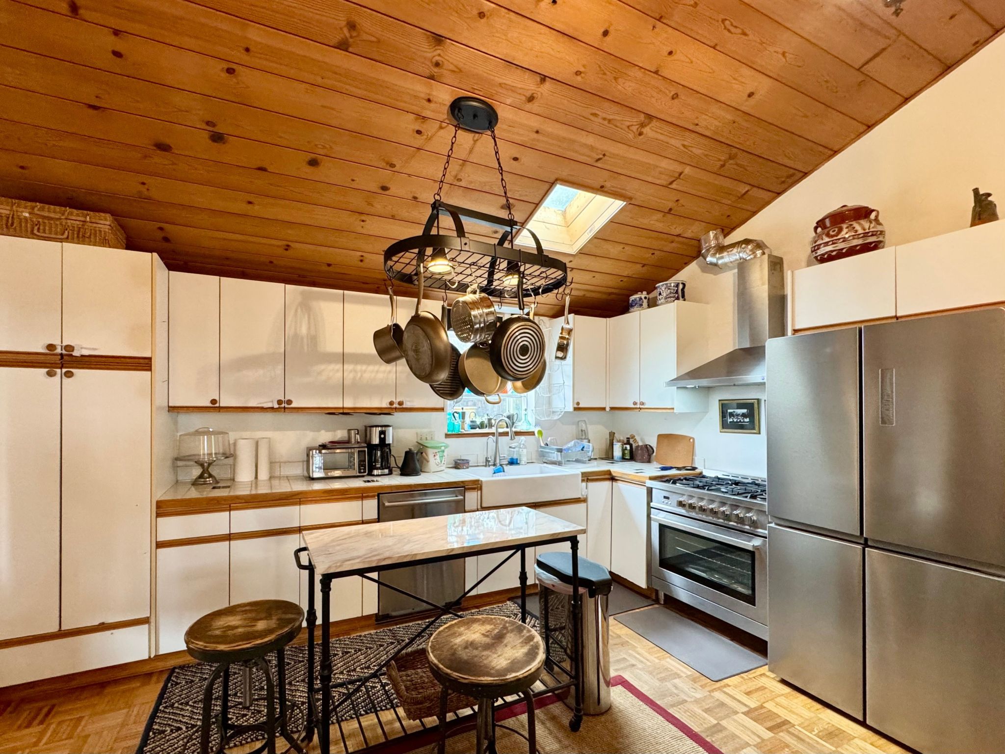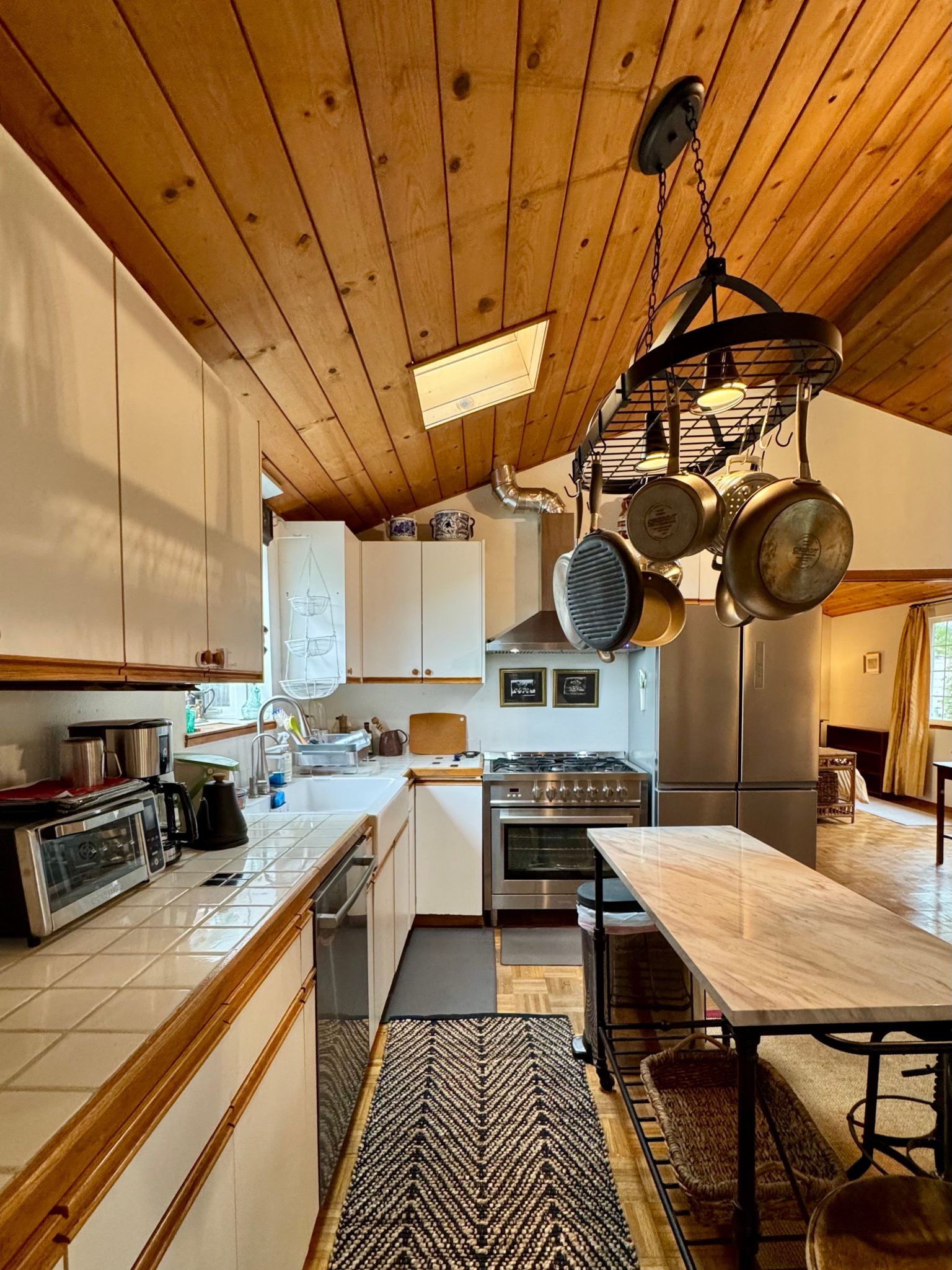 - High exposed wood ceilings in living room, kitchen, and bedroom