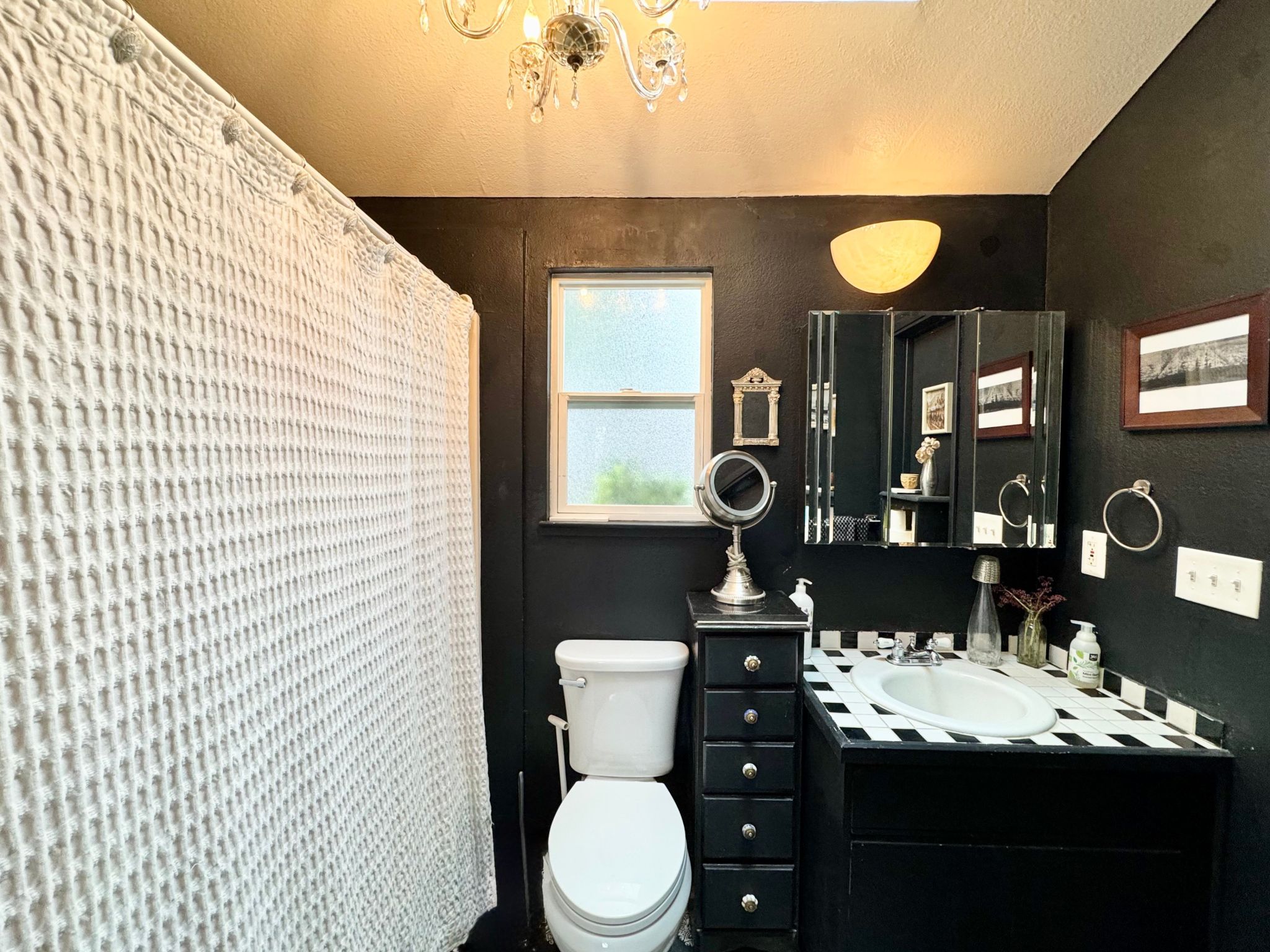 Step inside to a bright and inviting living space featuring high exposed wood ceilings in the living room, kitchen, and bedroom, creating an open and airy atmosphere throughout. The thoughtfully designed layout includes a fully stocked kitchen with stainless steel appliances — including a gas stove, dishwasher, and refrigerator — plus a dining area with a skylight that fills the space with natural light. The living room includes a cozy seating area with a sofa that converts into a bed, offering flexibility for guests. The bedroom features a comfortable king-size bed and plenty of natural light. A stove-style fireplace adds warmth and character on cool Napa evenings, while a split AC/heating system and in-unit washer and dryer provide modern convenience.