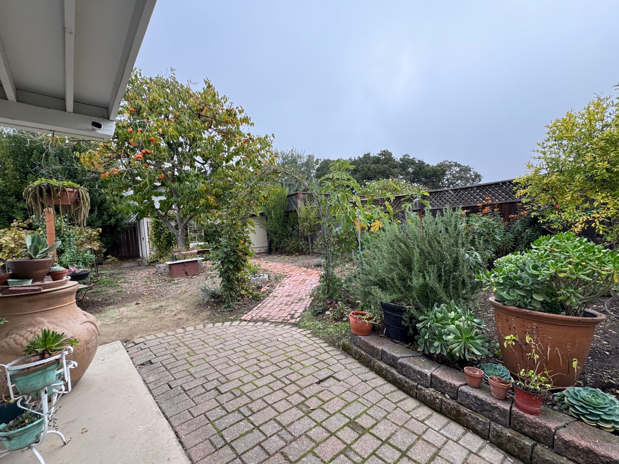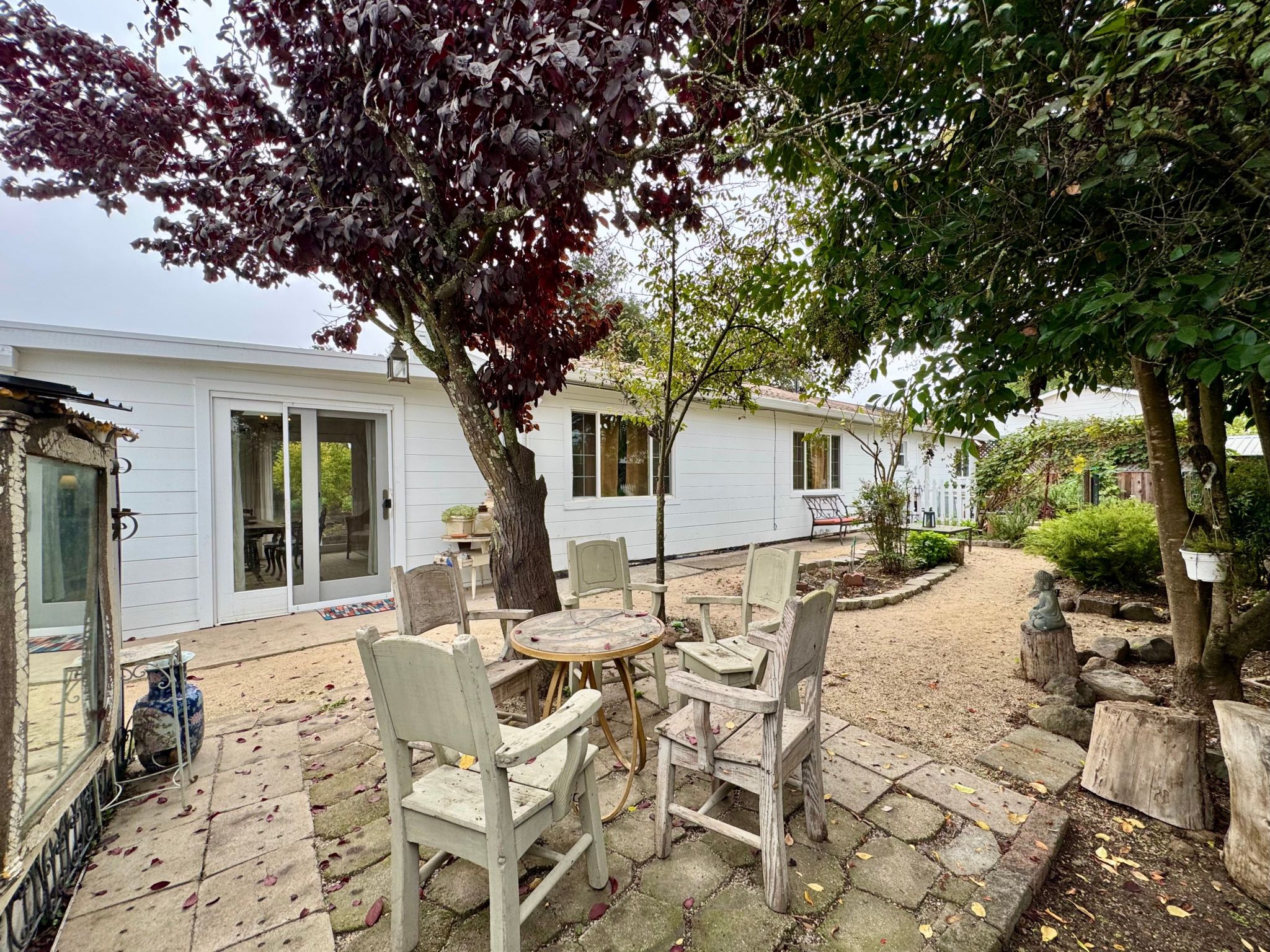 - Private fenced yard surrounded by gardens and nature