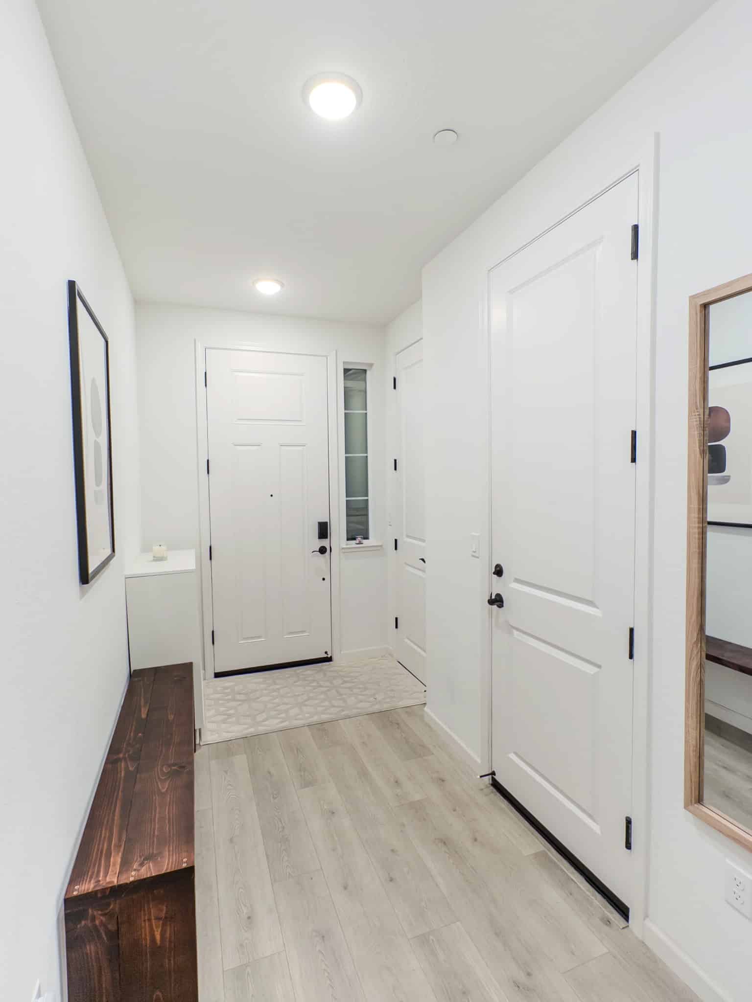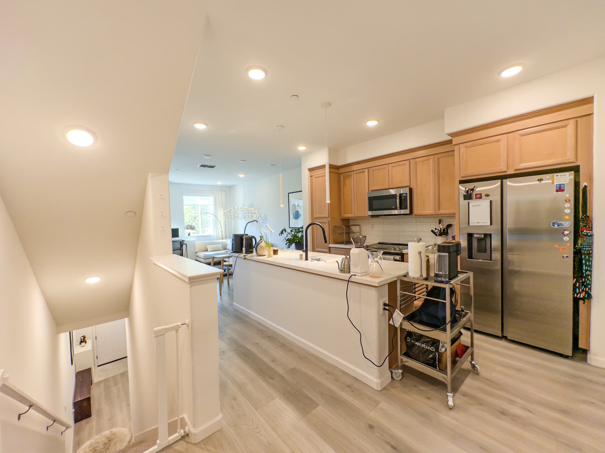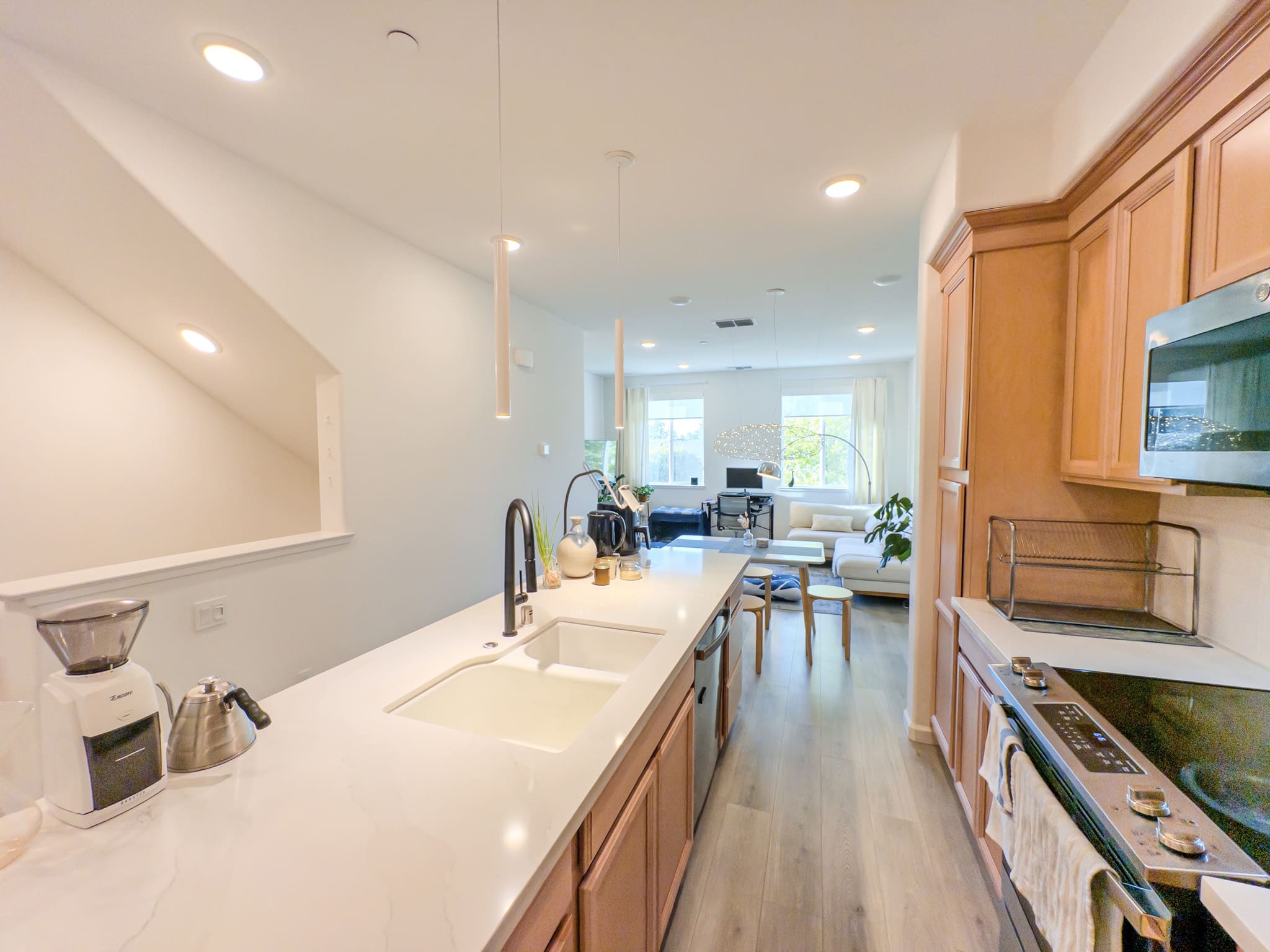 The home showcases quality LVP and carpet flooring throughout, enhanced by recessed and pendant lighting fixtures in the living room. Contemporary roll-up blinds provide clean sight lines with minimal visual impact.