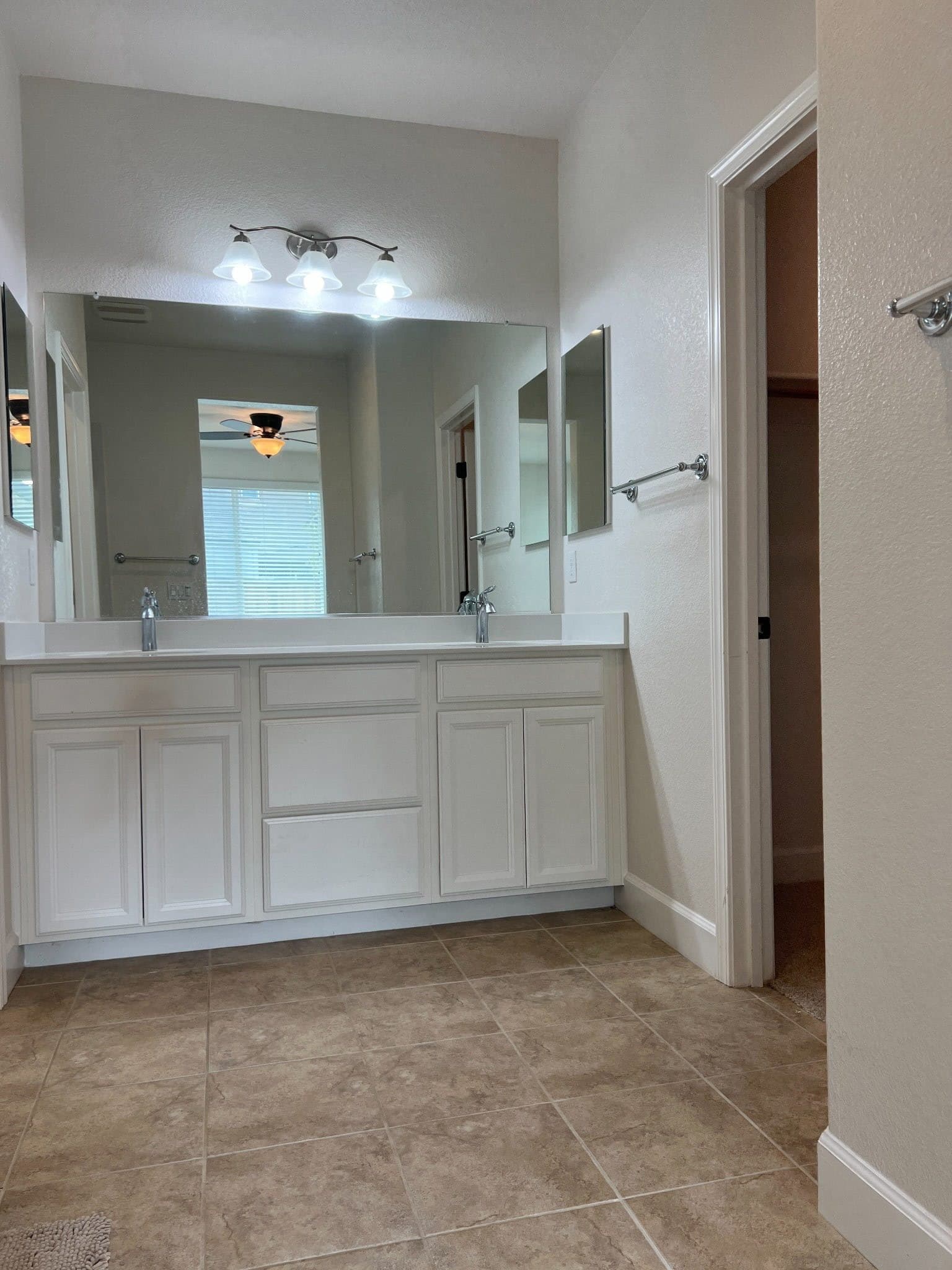 The primary suite offers a peaceful retreat with a walk-in closet, dual vanity sinks, and a large walk-in shower.